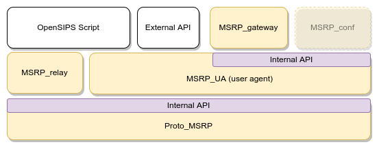 In the same time, the MSRP UA module exposes an internal API to be used by any modules implementing advanced MSRP functionalities. Right now the MSRP (to SIP Message) gateway module is the only one that implements the API. For the future versions we target an MSRP conferencing module, also using the MSRP UA module for implementing the MSRP end points in the conference.