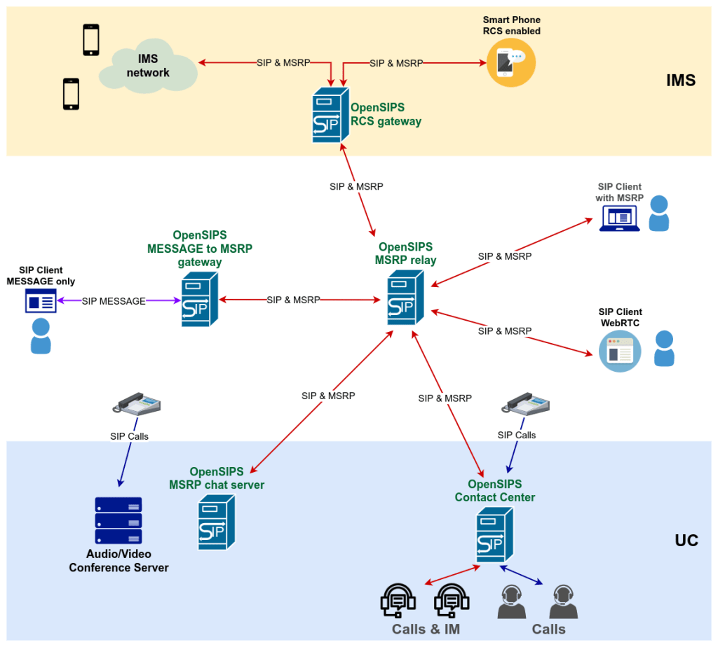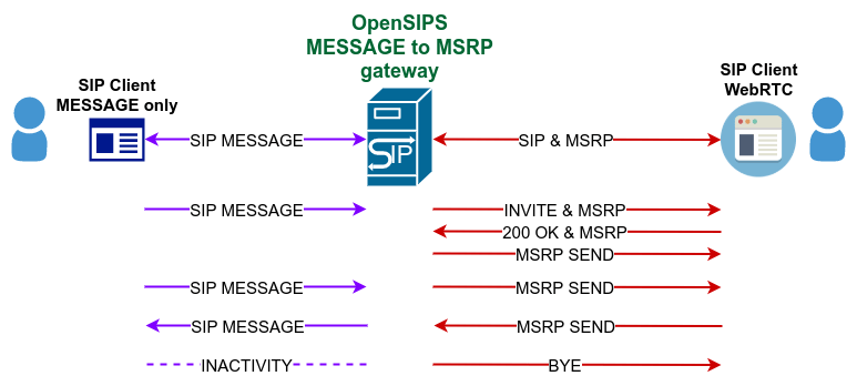 To support SIP clients with Page Mode (SIP MESSAGE) as well, OpenSIPS 3.3 is able to act as a Gateway between SIP MESSAGE (or “Page Mode”) and MSRP-based (“Session Mode”) Instant Messaging – in this way, such SIP clients (with MESSAGE only support) will be able to access all the advanced messaging services built on top of MSRP (like chats, Queuing, RCS, etc).