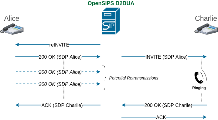 The provisional media mechanism will still be available but OpenSIPS 3.4 also provides two straightforward approaches to prevent the re-bridging problems discussed previously. The objective for both solutions is to eliminate the ringing time interval between the 200 OK and ACK on any of the call legs. The basic idea behind this is to have the new entity already answer the call before triggering a SDP renegotiation on the old entity. So if we do have to include at some point, SDP from the other side in an ACK , the 200 OK would always be an answer to a reINVITE (in order to receive it quickly).